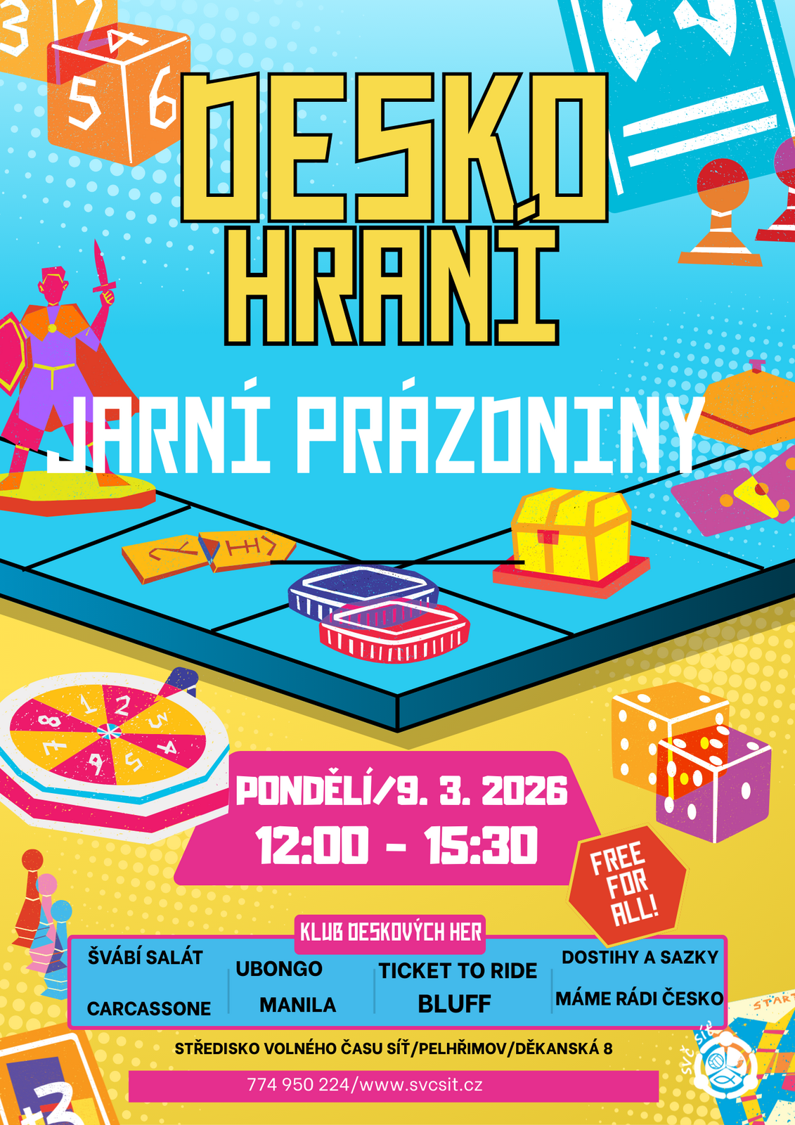 ÚvodKalendářJarní deskohraní 2026 Jarní deskohraní 2026 Nevíš co v pondělí o jarňákách? Vezmi kámoše a doraž si zahrát deskovku :-) Hlavní rubrika: Kalendář Rubriky: Kalendář, Pelhřimov, Příležitostné akce Datum: 9. března 2026 Místo: Pelhřimov Organizátor: Středisko volného času Síť Zpět | Nahoru | Tisk Sdílet: