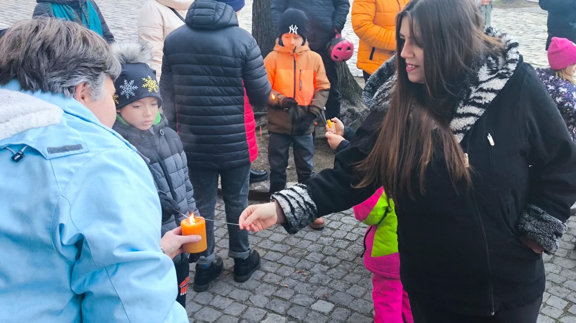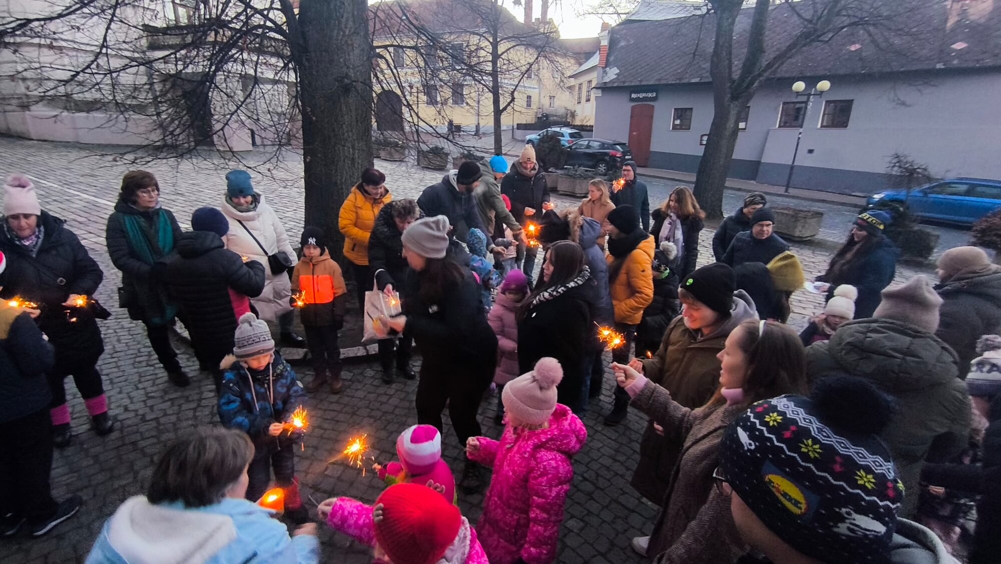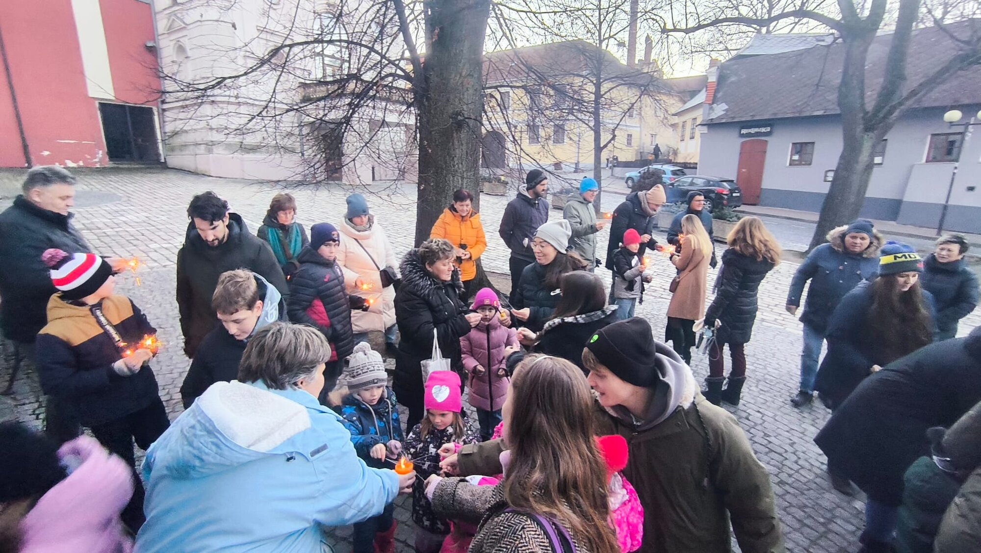 Celé společenství se potom přesunulo ven, před kostel. Zde jsme rozsvítili prskavky a společně zazpívali píseň Narodil se Kristus Pán. Na cestu domů děti, ale i dospělí ještě dostali drobný dárek.
