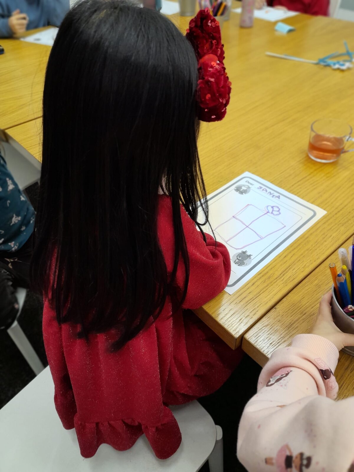 Součástí programu bylo také povídání o rozdílech mezi českými Vánocemi a svátky v Americe. Děti se dozvěděly, jak to má Santa Claus s komínem, a rozšířily si svůj kulturní přehled. Přirozeně se tak učily vnímat, že svět je pestrý a že různé tradice mohou fungovat jinak – a přesto být stejně kouzelné.