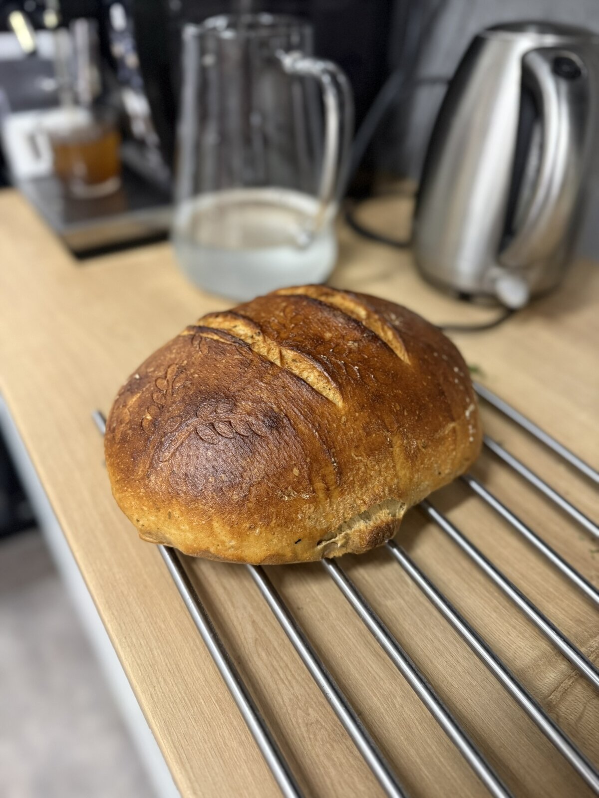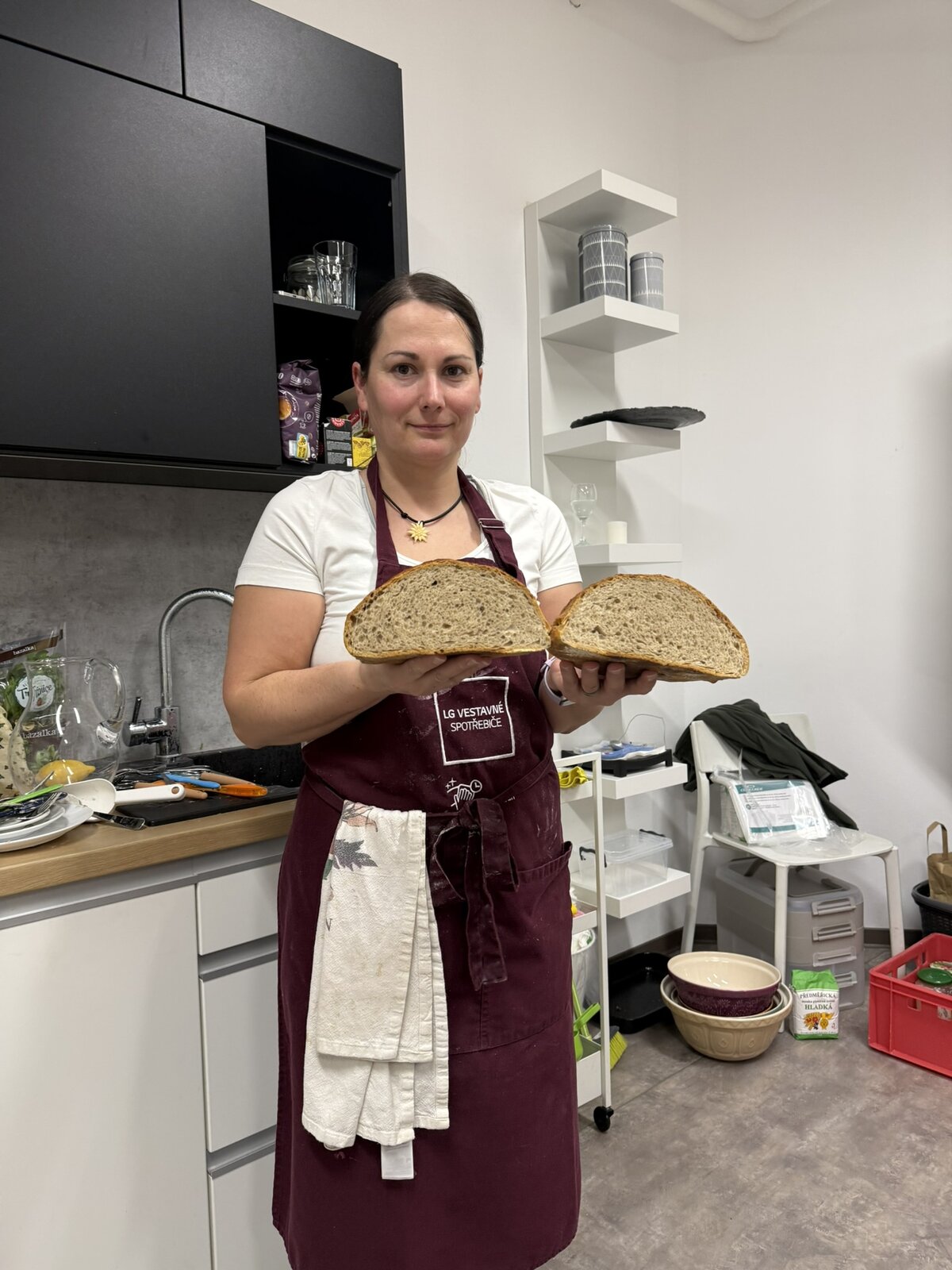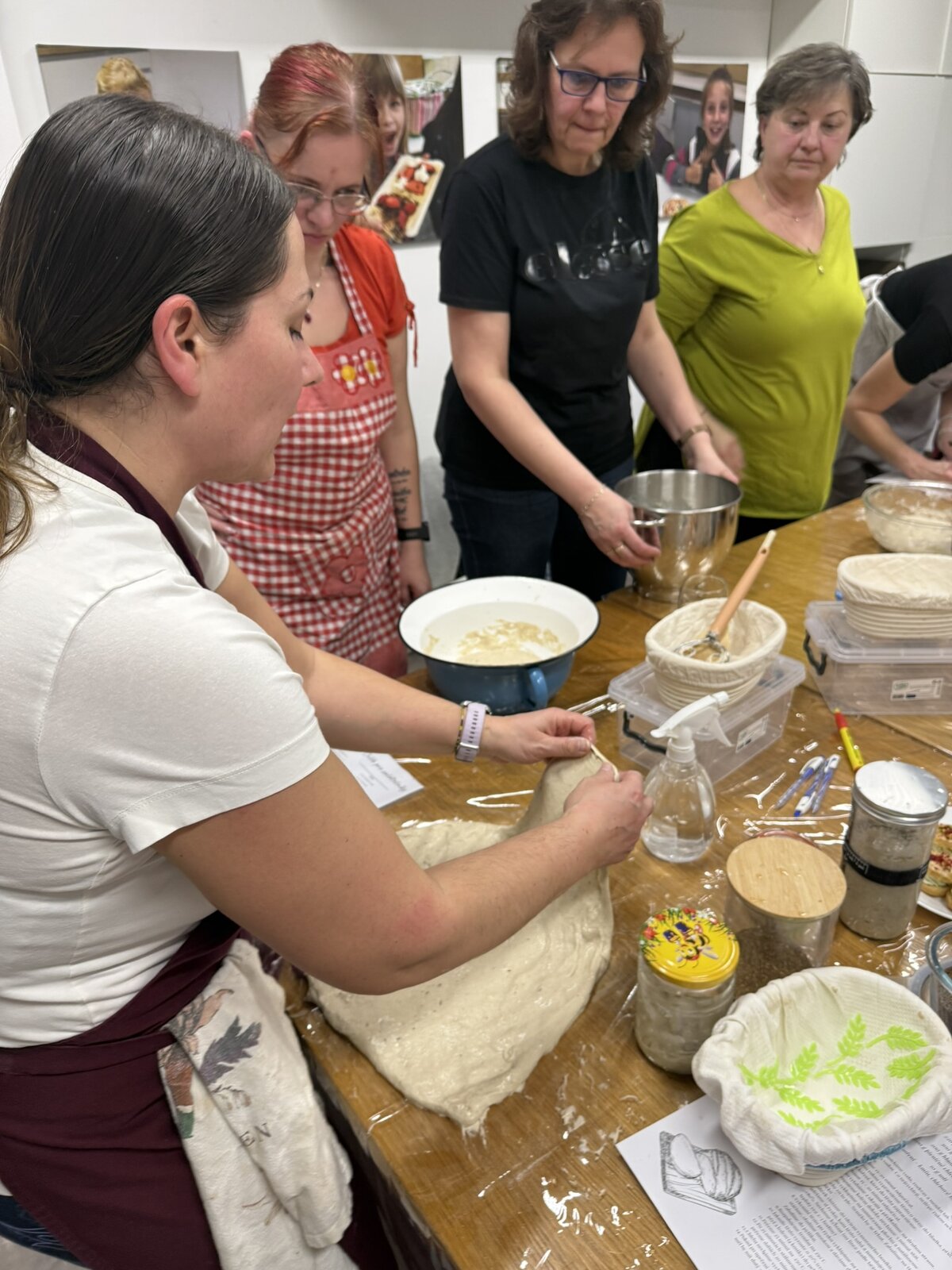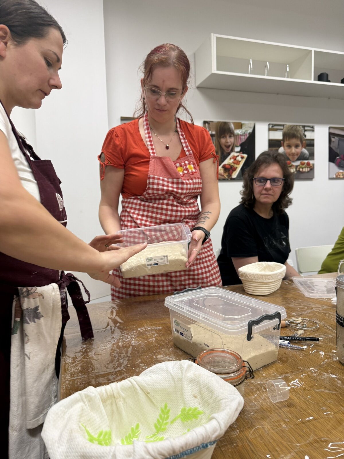 Pod vedením zkušené lektorky Katky Průšové jsme si prošli celý proces přípravy tradičního kváskového chleba. Tedy jak založit a starat se o kvásek, aby vydržel a dobře kynul, jak správně připravit těsto, jak pracovat s ošatkou a formovat bochník.