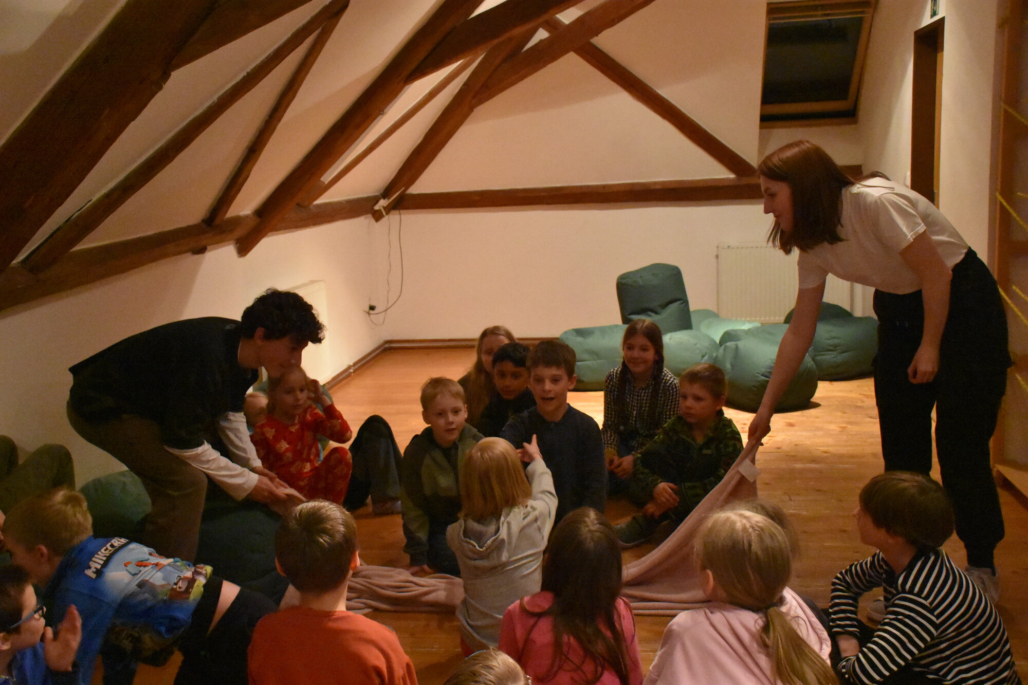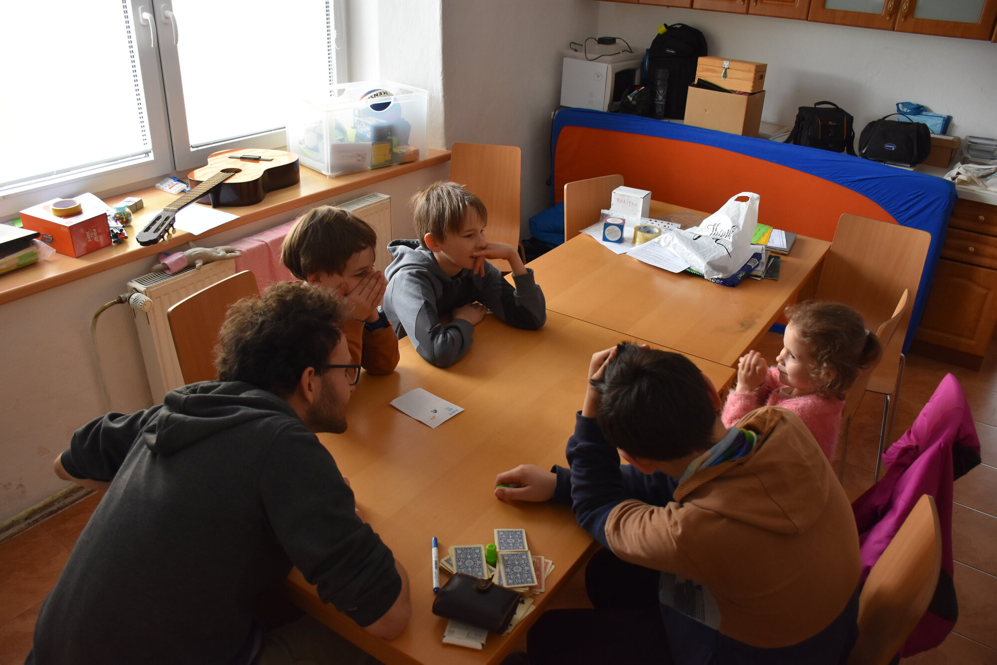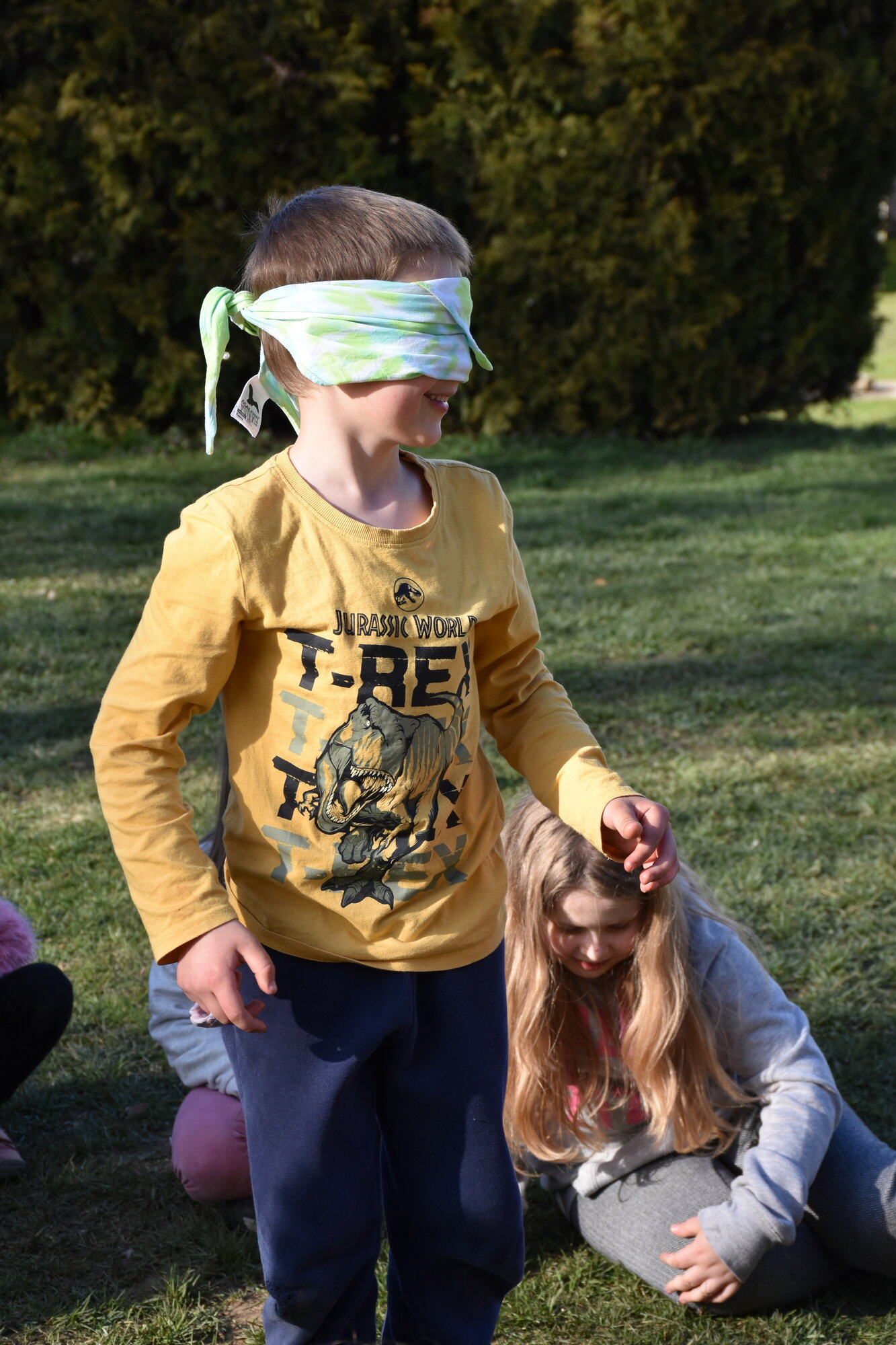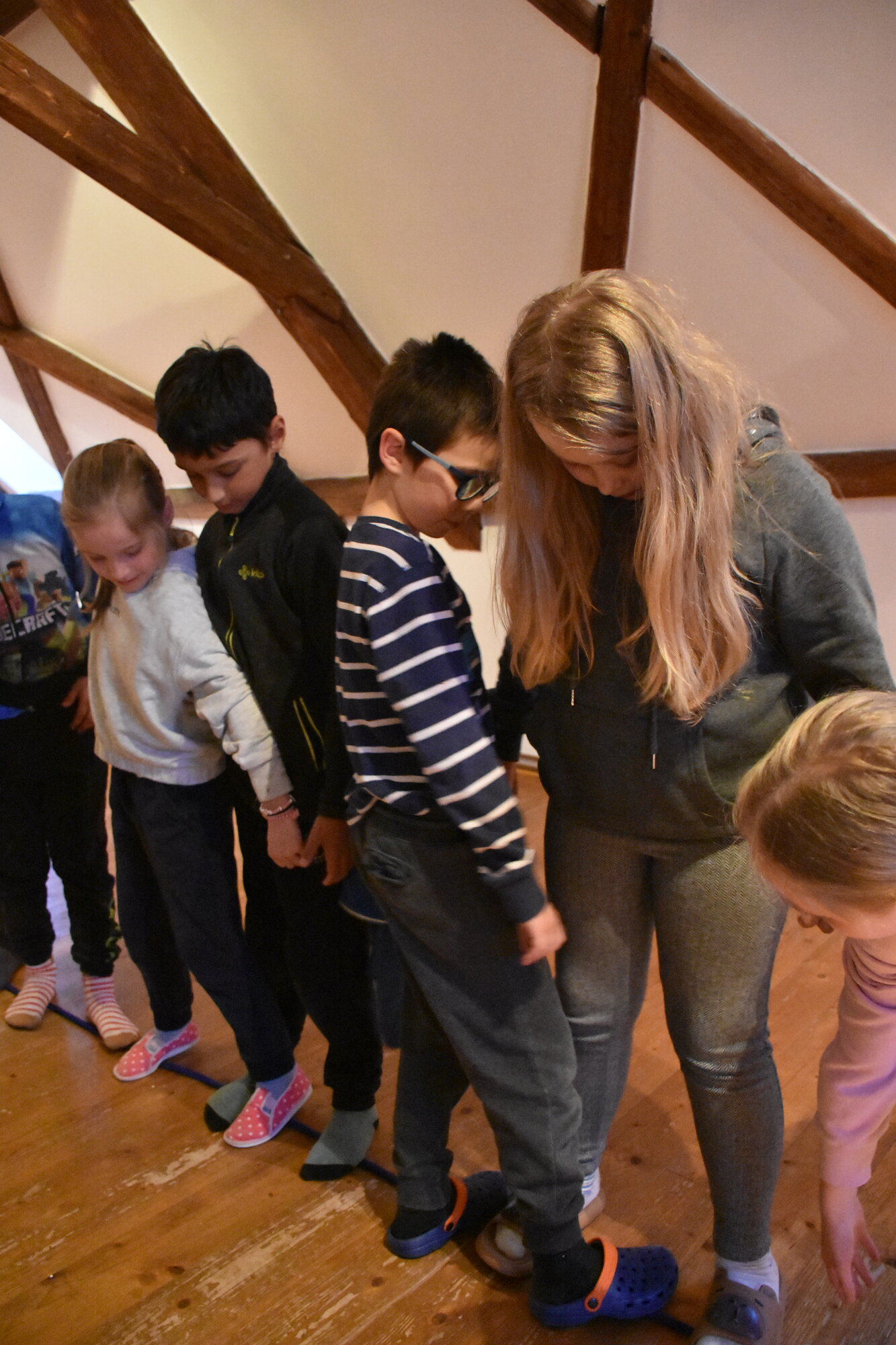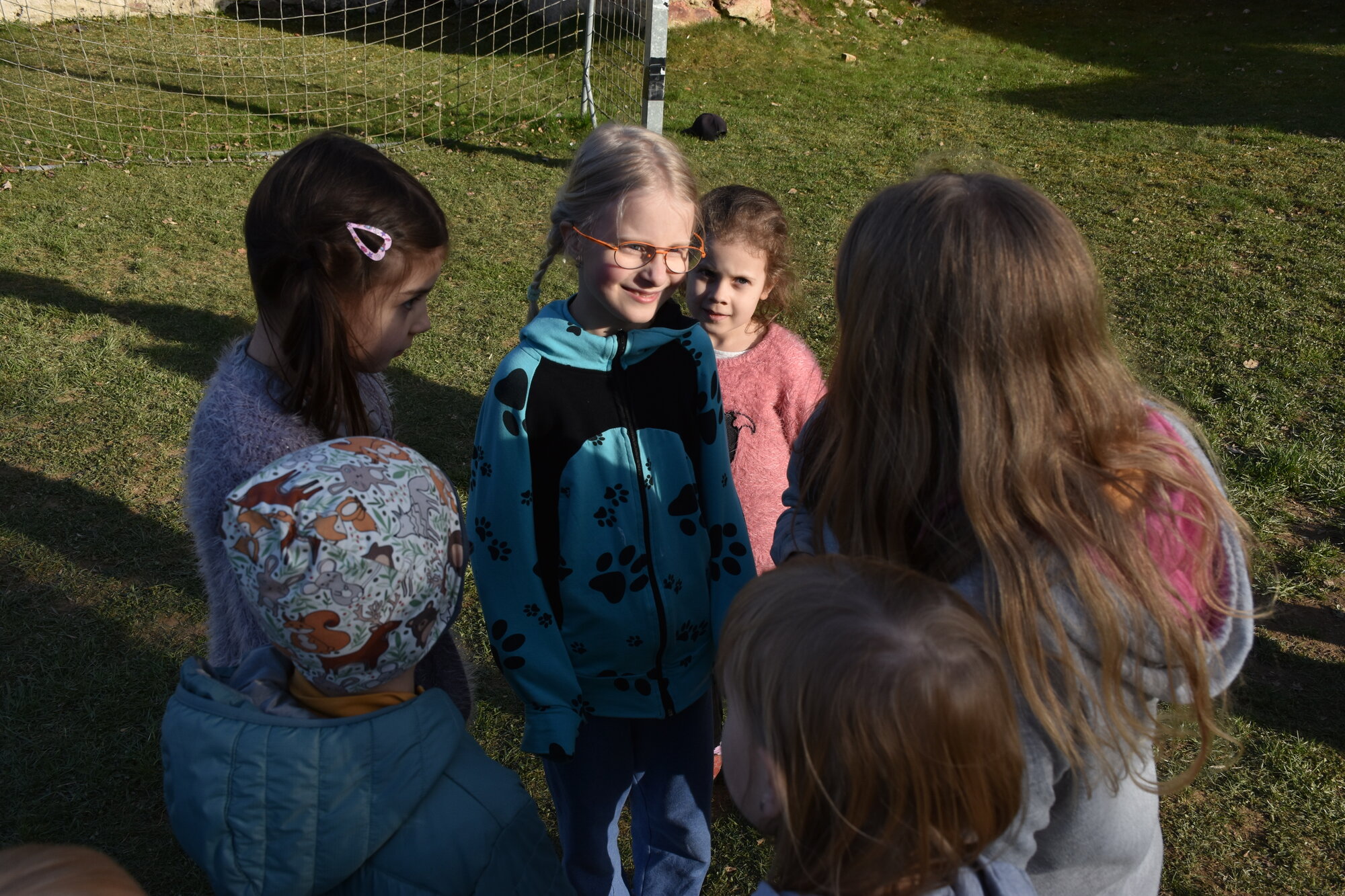 Hned poté přišly na řadu seznamovačky. Každý se představil a řekl, co rád dělá. Pak jsme jména ještě procvičovali pomocí dalších krátkých aktivit. Když už jsme se všichni znali, společně jsme se navečeřeli a pak jsme pokračovali ve hrách. Nejdříve se děti řadily na laně podle zadání, třeba podle výšky. Ale nesměly udělat krok pryč z lana. Poté jsme ještě jednou zopakovali jména, tentokrát v rytmu hudby s tleskáním. Po programu následovalo zklidnění v podobě modlitby. No a pak už jen večerní hygiena, pohádka na dobrou noc a všichni šli spát.