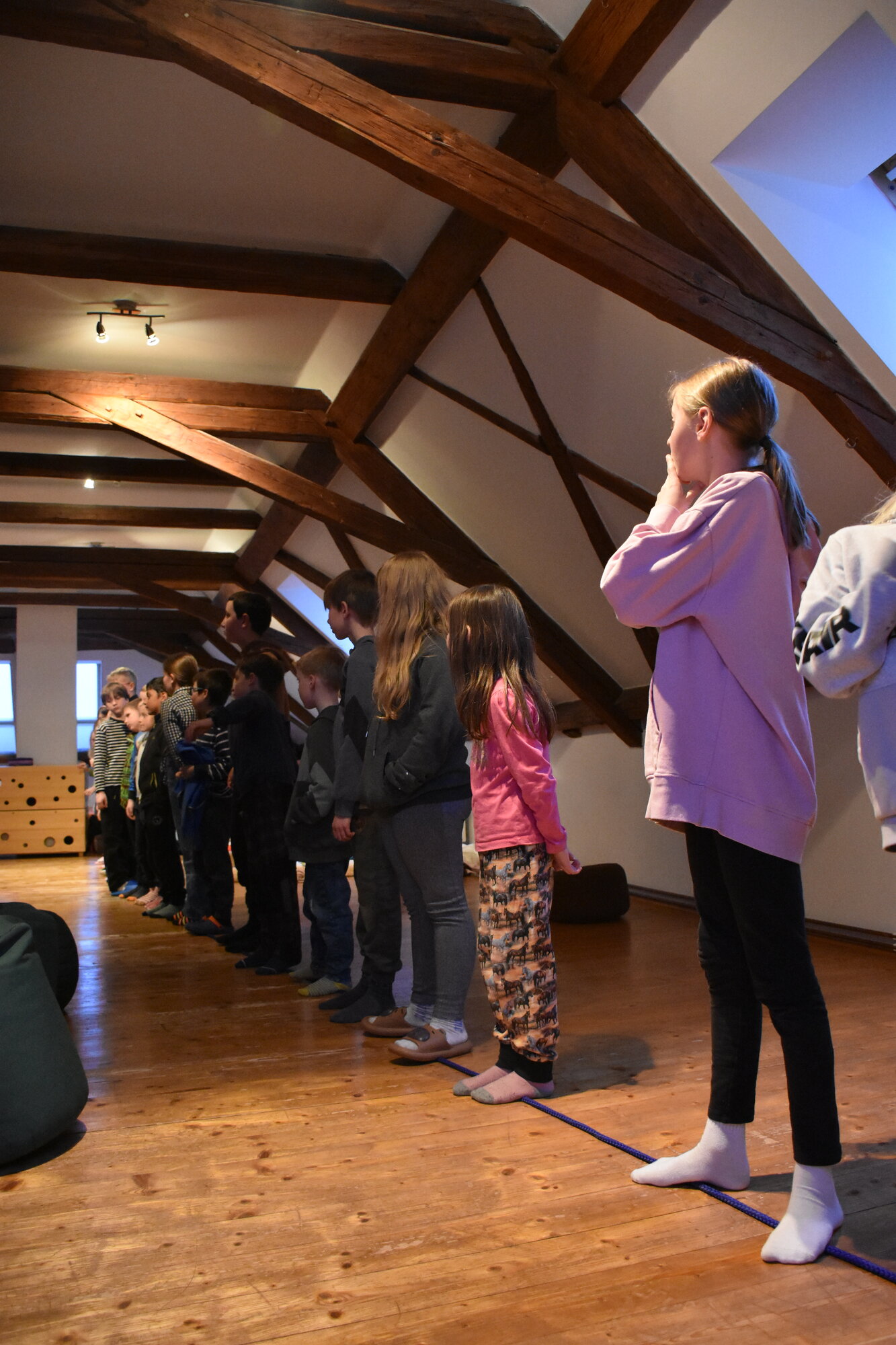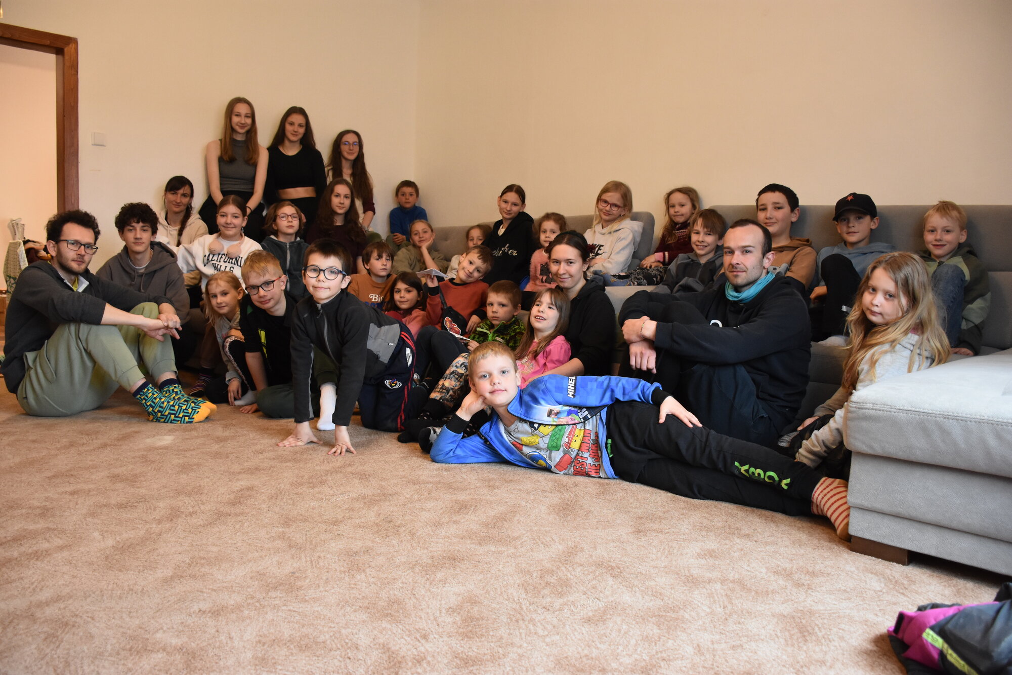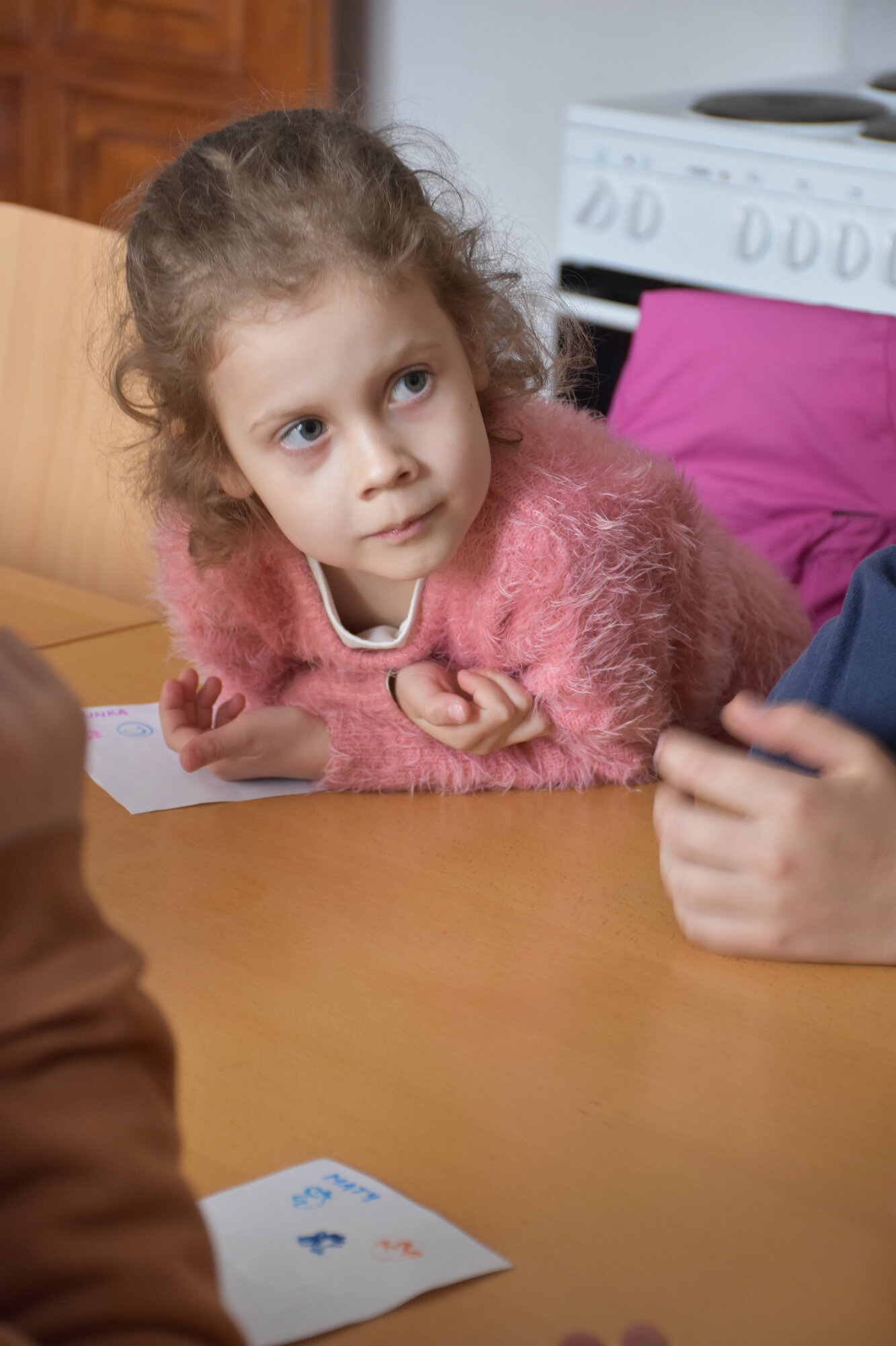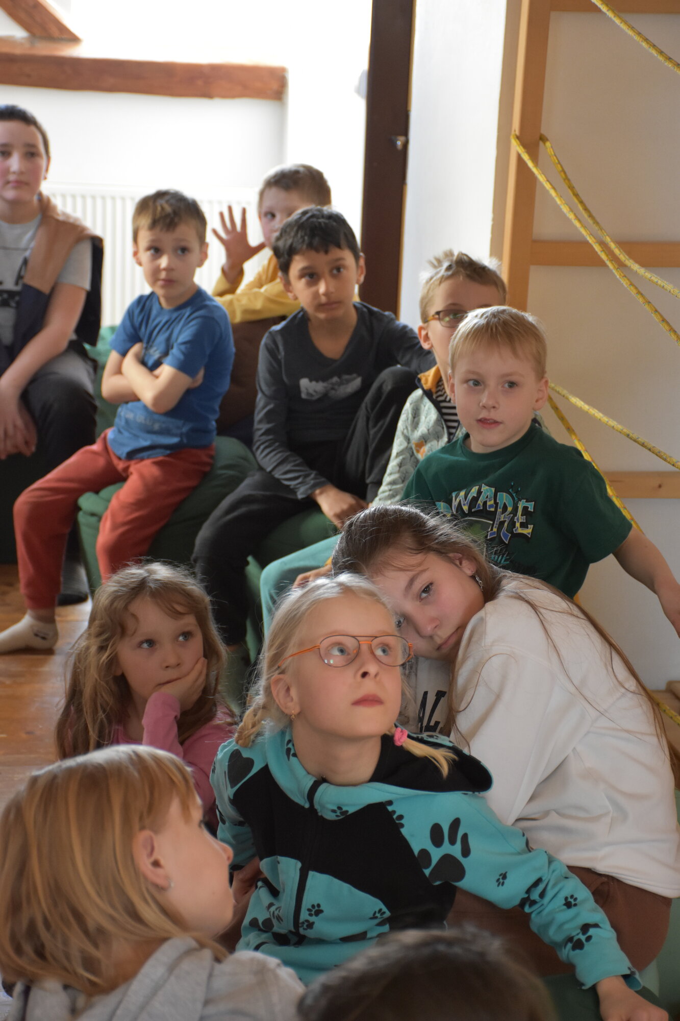 Hned poté přišly na řadu seznamovačky. Každý se představil a řekl, co rád dělá. Pak jsme jména ještě procvičovali pomocí dalších krátkých aktivit. Když už jsme se všichni znali, společně jsme se navečeřeli a pak jsme pokračovali ve hrách. Nejdříve se děti řadily na laně podle zadání, třeba podle výšky. Ale nesměly udělat krok pryč z lana. Poté jsme ještě jednou zopakovali jména, tentokrát v rytmu hudby s tleskáním. Po programu následovalo zklidnění v podobě modlitby. No a pak už jen večerní hygiena, pohádka na dobrou noc a všichni šli spát.