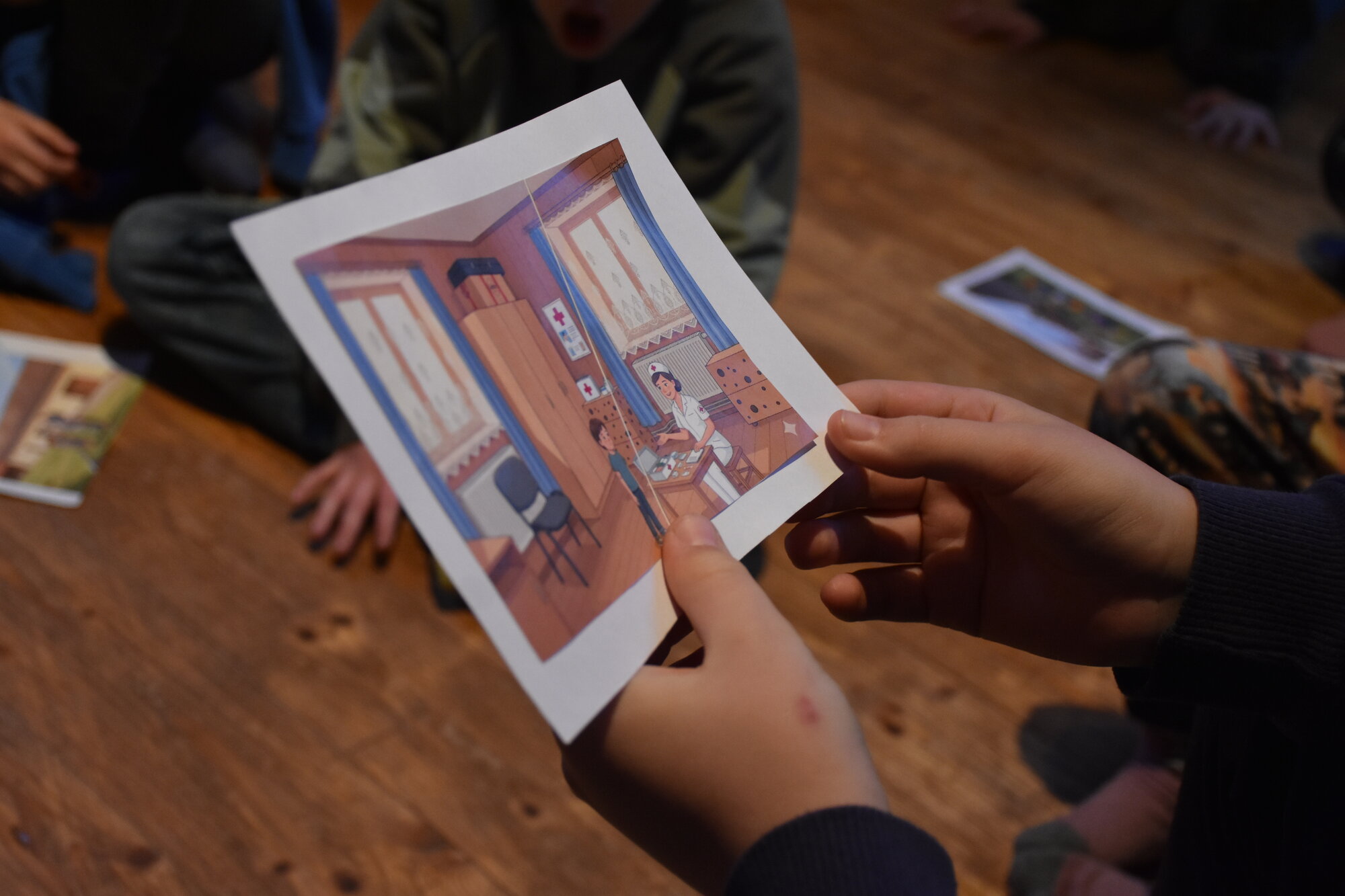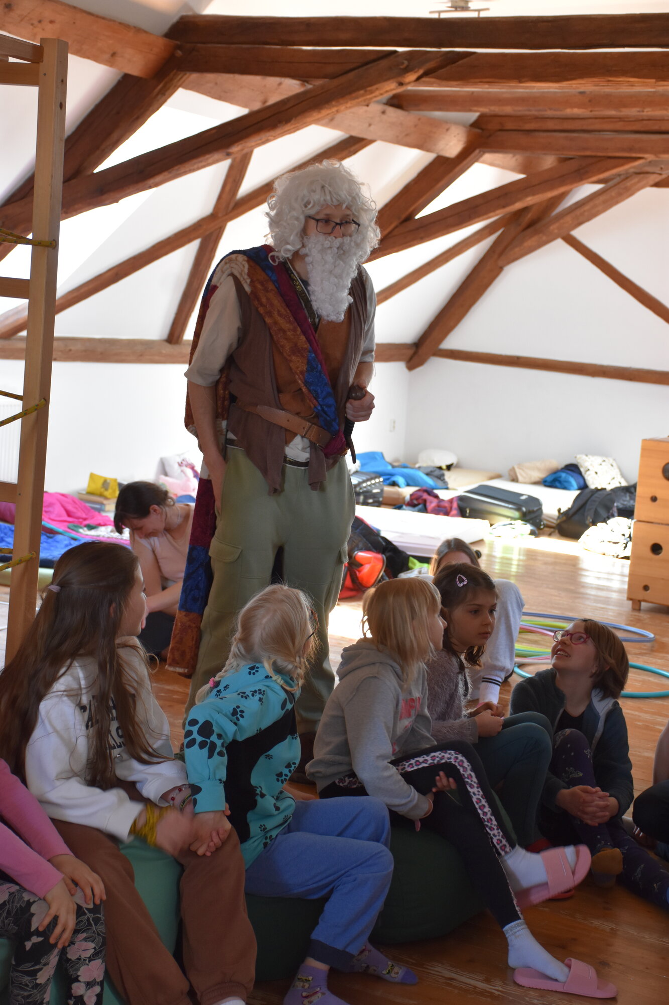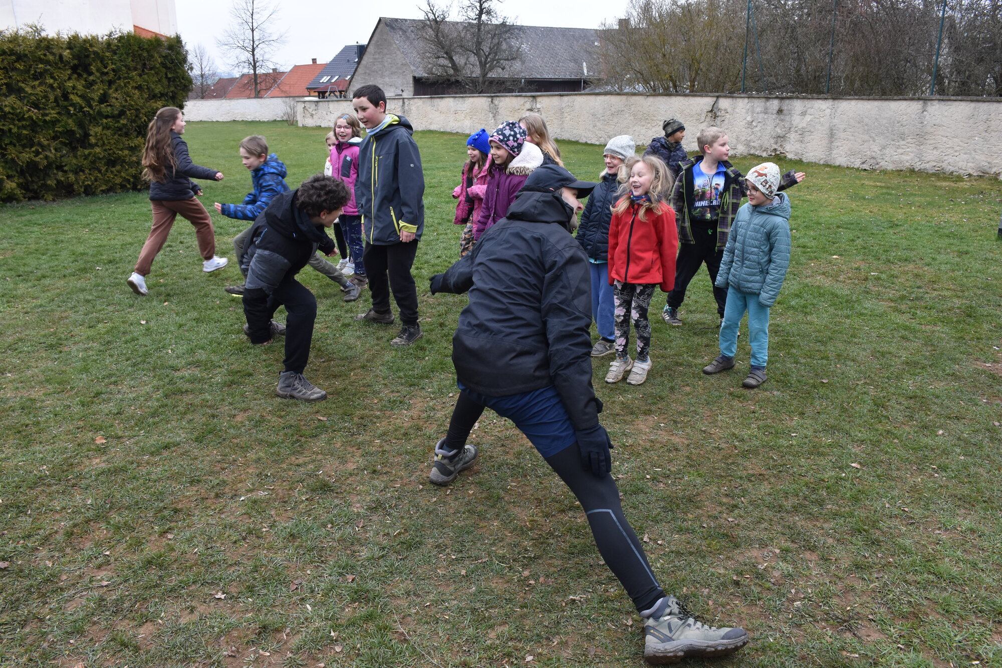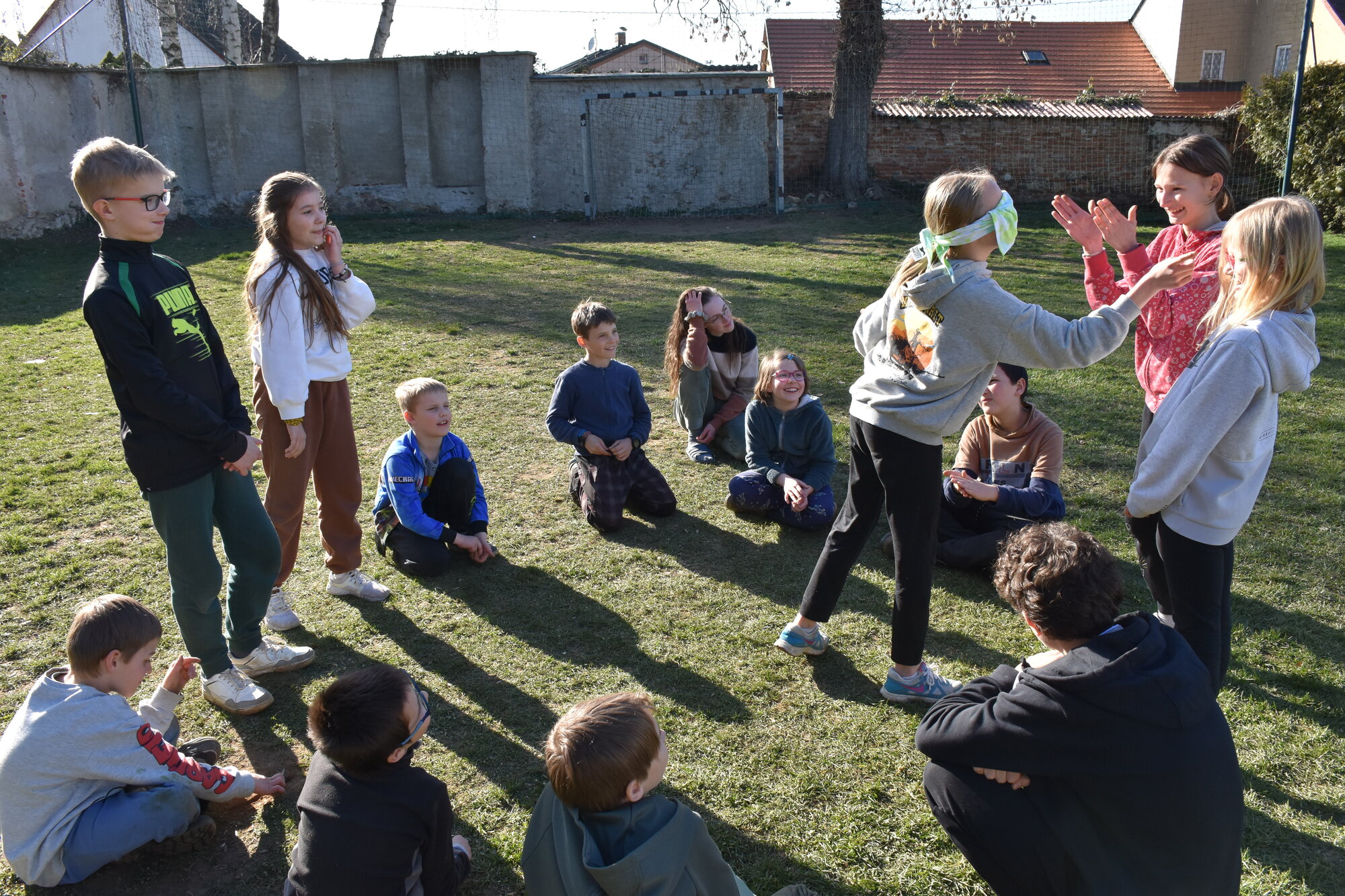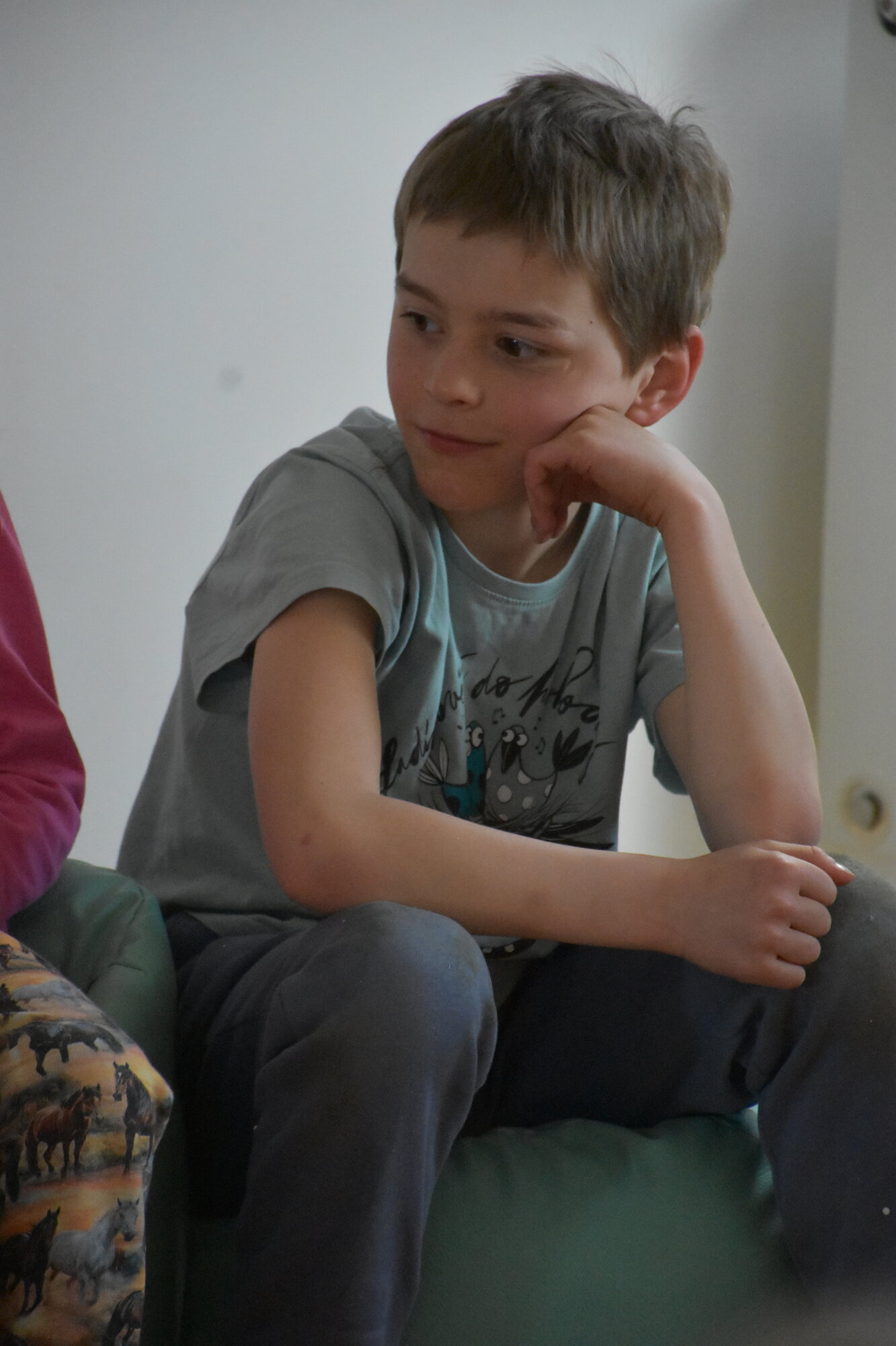 Hned poté přišly na řadu seznamovačky. Každý se představil a řekl, co rád dělá. Pak jsme jména ještě procvičovali pomocí dalších krátkých aktivit. Když už jsme se všichni znali, společně jsme se navečeřeli a pak jsme pokračovali ve hrách. Nejdříve se děti řadily na laně podle zadání, třeba podle výšky. Ale nesměly udělat krok pryč z lana. Poté jsme ještě jednou zopakovali jména, tentokrát v rytmu hudby s tleskáním. Po programu následovalo zklidnění v podobě modlitby. No a pak už jen večerní hygiena, pohádka na dobrou noc a všichni šli spát.